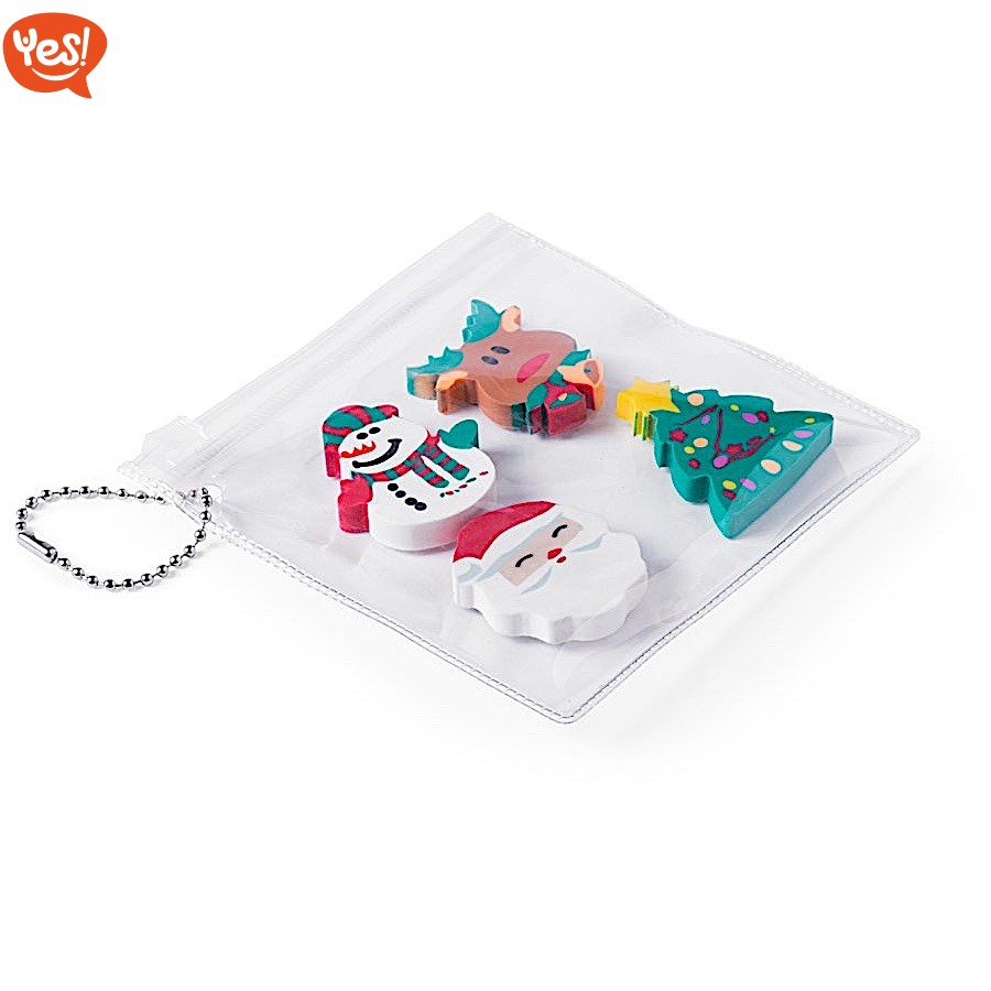 Set di gomme con disegni natalizi, confezionate in bustina trasparente richiudibile in PVC con catena per aggancio. Apposita area bianca per la stampa.